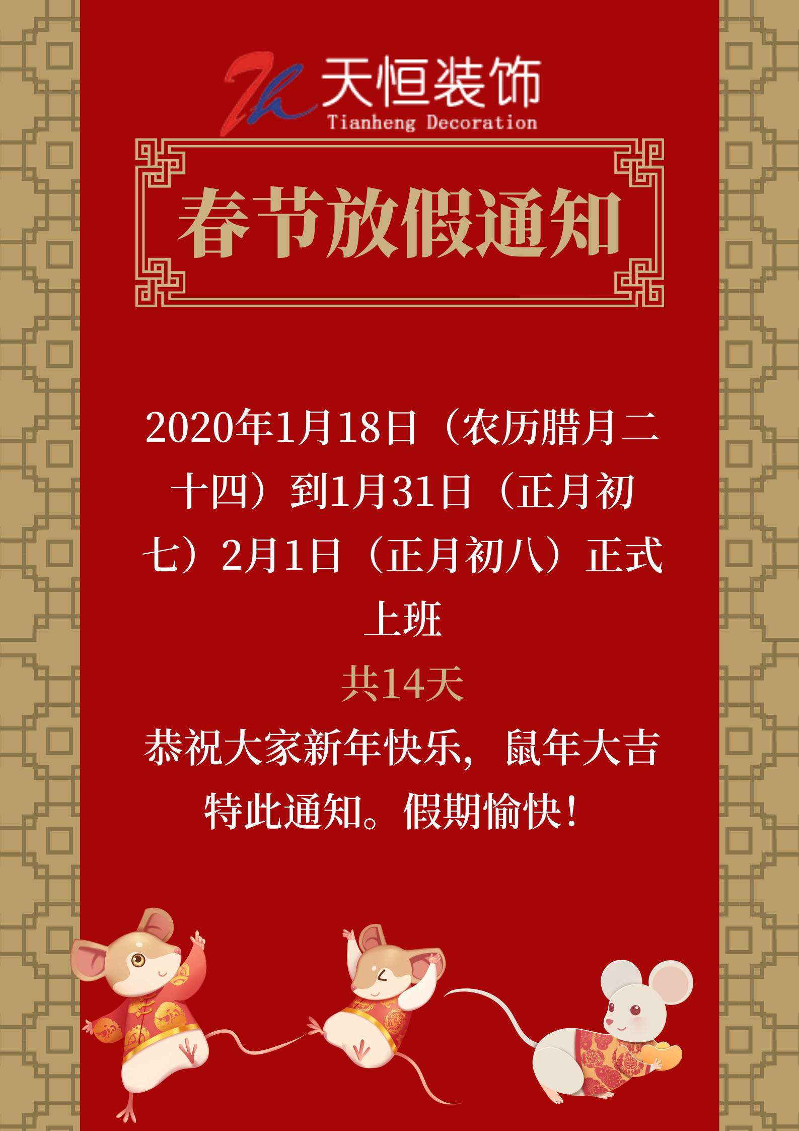 首頁 > 新聞資訊 > 2020年河南天恒裝飾春節(jié)放假通知